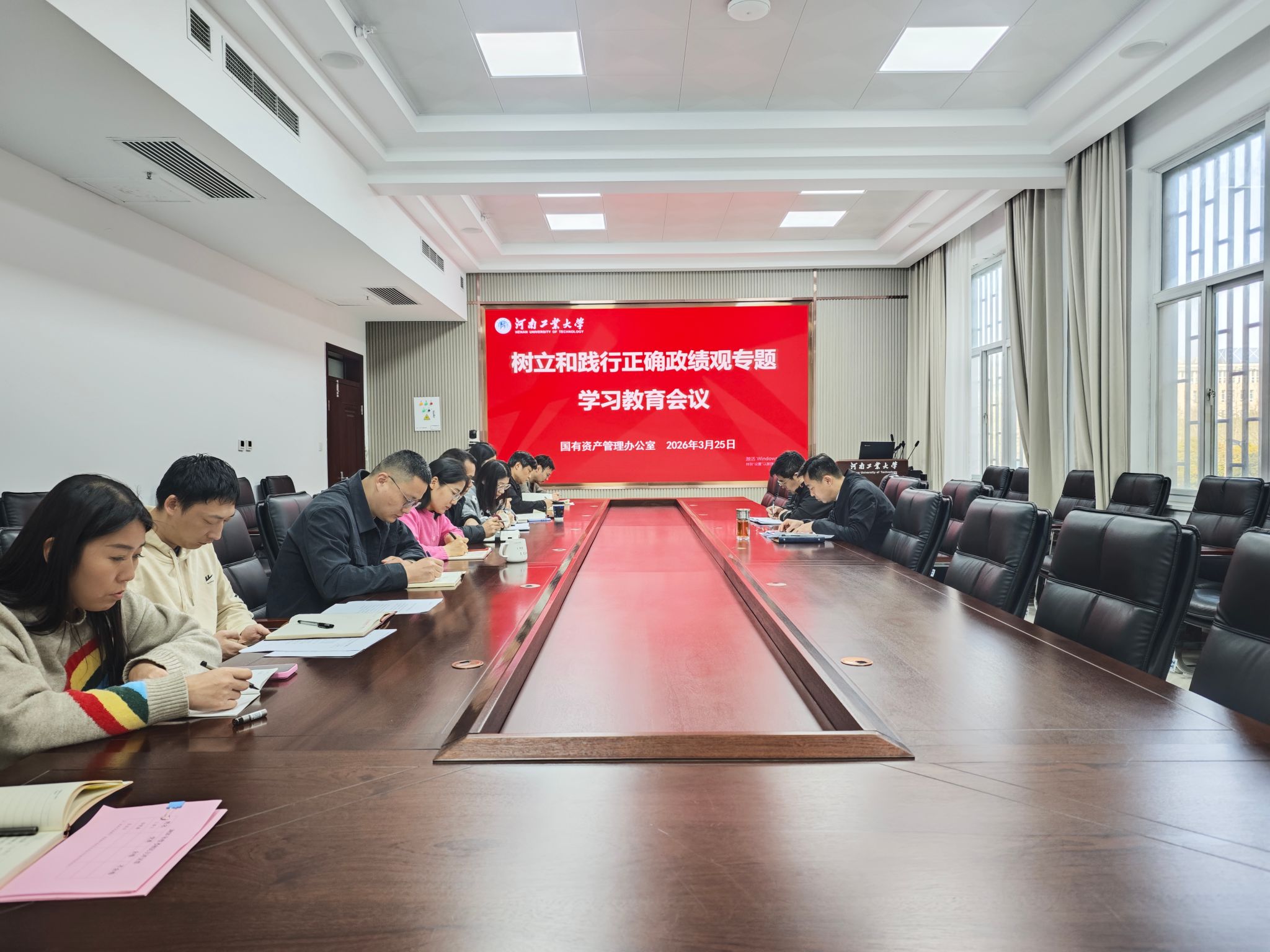 会上,刘洋带领全体人员深入学习领会了习近平总书记关于树立和践行正确政绩观的重要讲话和经典论述。他强调政绩观是干事创业的“指南针”、检验党性的“试金石”,对于学校国资管理工作而言,正确的政绩观就是坚守“为党育人、为国育才”初心,把规范管理、提质增效、保值增值作为核心目标,不搞急功近利、不做表面文章,多做打基础、利长远、惠师生的实事,以实干实绩守护学校国有资产。